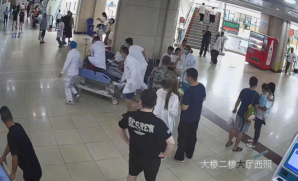 在等待转运期间,刘经伟、刘化青、李豪豪三人轮流接力实施胸外按压,确保按压持续有效,为患者维持关键生命体征。4分钟后,孙成建、陈红及急救人员推着转运车快速抵达二楼抢救现场,与陈红及急救人员汇合。众人合力将患者抬上转运车,刘经伟主动跨上转运车,在转运途中持续进行胸外按压,直至患者安全送达急诊抢救室。
